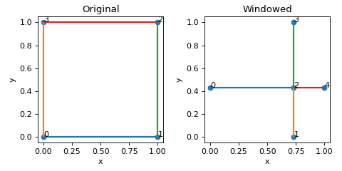 >>> nodes = [[0,0,0],[1,0,0],[1,1,0],[0,1,0]] >>> edges = [[0,1],[1,2],[2,3],[3,0]] >>> lat = Lattice(nodal_positions=nodes, edge_adjacency=edges) >>> lat {'num_nodes': 4, 'num_edges': 4} >>> lat_w = lat.create_windowed() >>> lat_w {'num_nodes': 5, 'num_edges': 4}