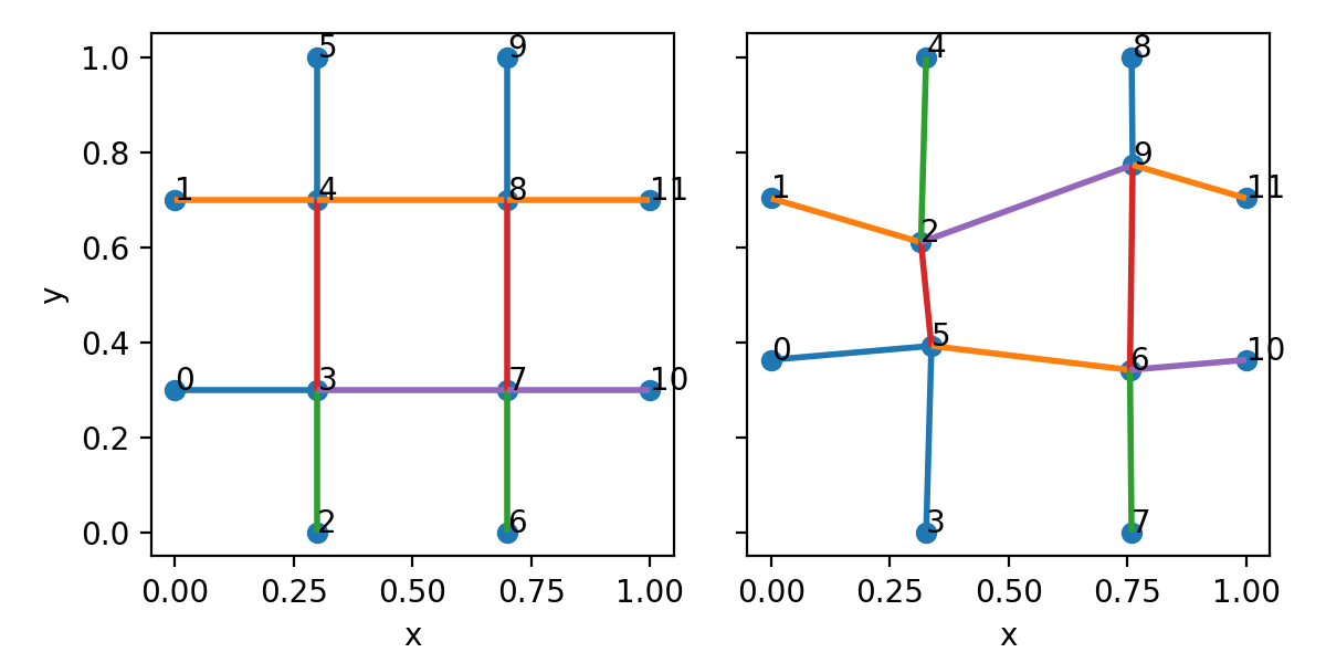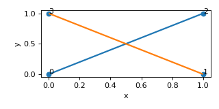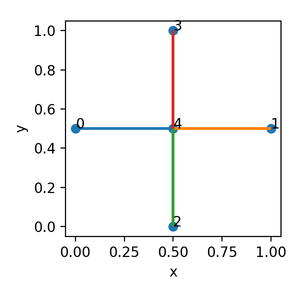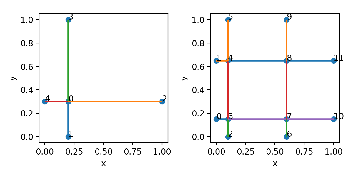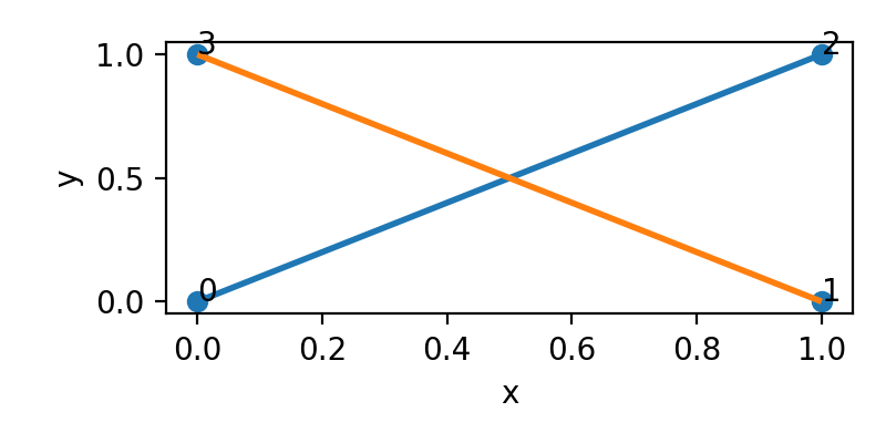 >>> nodes = [[0,0,0],[1,0,0],[1,1,0],[0,1,0]] >>> edges = [[0,2],[1,3]] >>> lat = Lattice(nodal_positions=nodes, edge_adjacency=edges) >>> lat {'num_nodes': 4, 'num_edges': 2} >>> edge_intersections = lat.find_edge_intersections() >>> lat.split_edges_by_points(edge_intersections) >>> lat {'num_nodes': 4, 'num_edges': 4}